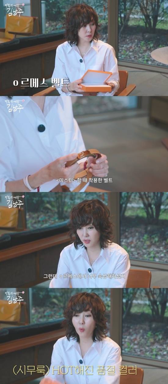 김남주는 명품 벨트를 꺼내 들며 "여분으로 셔츠 원피스에 다른 거 안 어울리면 '어거 할까?' 해서 하나 더 가져와 본 거다. '미스티' 할 때 착용한 벨트다. 이거 많이 사랑해 주셨다"라고 설명했다. 이어 그는 "그런데 브랜드에서 너무 속상해하셨다. 그 당시에 없는, 내가 사놓은 걸 하고 나갔다. 카멜이나 블랙 벨트는 안 나왔다"라며 브랜드에서 섭섭해했다고 말했다.