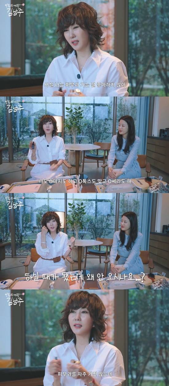 김남주는 "사실 나는 피부과 가는 걸 좋아하지 않는다. 그렇다고 안 가지는 않는다. 나도 써마지도 하고 보톡스도 맞고 울쎄라도 한다. 피부과에서 '하실 때가 됐는데 언제 오실 거냐'라고 연락이 온다"라며 받는 피부과 시술을 밝혔다.