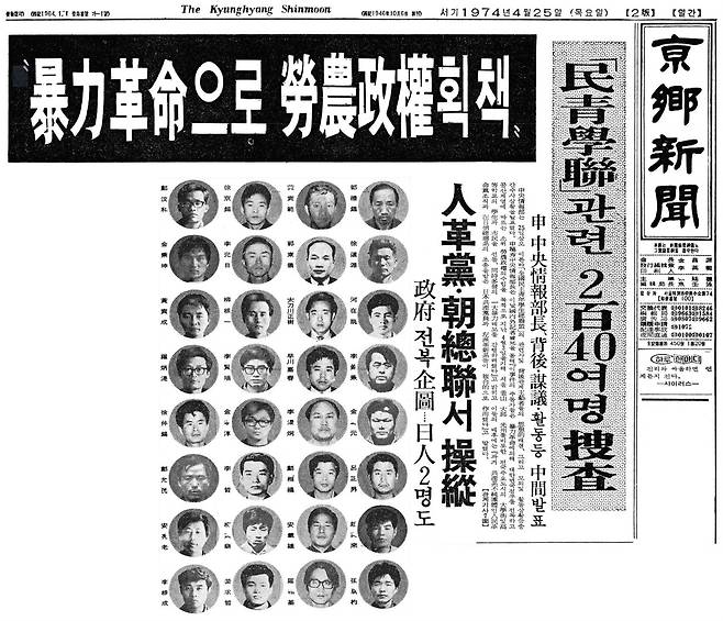 | ▲ 민청학련 사건을 발표한 1974년 4월 25일자 경향신문 기사. 사진 중 둘째 줄 맨 왼쪽이 김병곤 |
