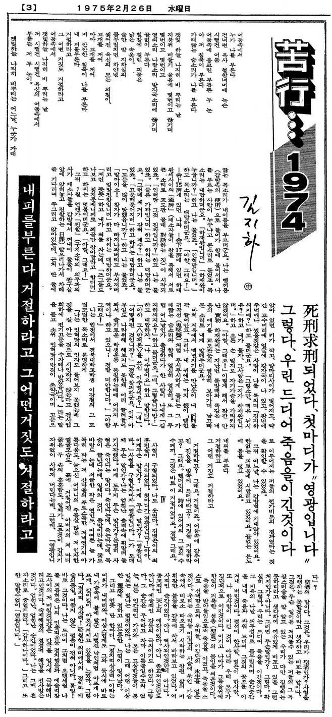 | ▲ 1975년 2월 25일부터 27일까지 3일간 <동아일보>에 연재한 김지하의 <고행...1974> 중 김병곤과 관련된 내용이 실린 2월 26일자 |