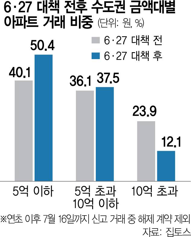 주택담보대출의 총액을 6억 원으로 제한하는 6·27 부동산 안정화 대책 이후 수도권 아파트 시장 거래 구조가 재편되고 있다. 10억 원을 초과하는 고가 아파트의 거래 비중은 반 토막 나고 10억 원 이하 중저가 아파트 거래는 늘어났다.