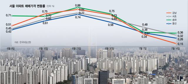 자치구별로 강남구(0.34%→0.15%), 서초구(0.48%→0.32%), 송파구(0.38%→0.36%) 상승세가 둔화됐다. 특히 강남구는 6월 다섯째 주(0.73%) 이후 2주 연속 상승률이 반 토막 났다.