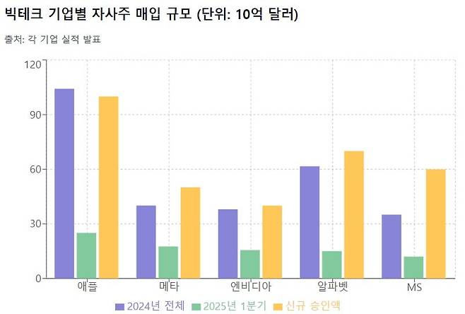 최근 자사주 매입의 주역은 미국 빅테크다. 애플, 마이크로소프트(MS), 알파벳(구글 모기업), 메타, 엔비디아 등이‘매그니피센트 7’ 기업들이 자사주 매입을 주도했다.