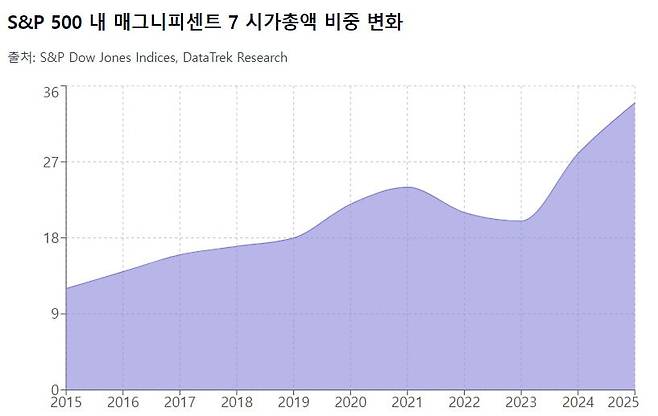 매그니피센트7 주식의 시가총액 합계는 2015년 S&P500의 12%에 불과했다, 하지만 10년 만에 세 배 가까이 올라 지수의 3분의 1 이상을 차지하게 된 것이다.