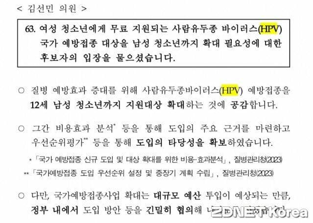 정 후보자는 답변서를 통해 ‘질병 예방효과 증대를 위해 HPV 예방접종을 12세 남성 청소년까지 지원대상 확대하는 것에 공감한다’며 ‘그간 비용효과 분석 등을 통해 도입의 주요 근거를 마련하고 우선순위평가 등을 통해 도입의 타당성을 확보했다’고 밝혔다. 다만 국가예방접종사업 확대에 대규모 예산 투입이 예상되는 만큼, 정부 내에서 도입 방안 등을 긴밀히 협의해 나가겠다고 덧붙였다.