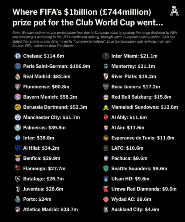 미국 매체 '디 애슬레틱'은 지난 16일(한국시간) 2025 국제축구연맹(FIFA) 클럽 월드컵 수익 분배를 조명했다.