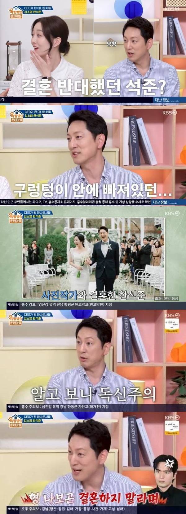 이날 한석준은 과거 김소영과 오상진의 결혼을 반대했다며 “결혼 자체를 반대했다. 당시 내가 (이혼 후) 구렁텅이에 빠져 있던 시기라 말렸던 것”이라고 설명했다.