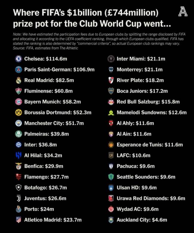 울산은 이번 대회를 통해 960만 달러(약 133억 원) 얻게 됐다. 세계 챔피언에 오른 첼시(잉글랜드)는 1억 1460만 달러(약 1589억 원)를 벌어들였다. 글로벌 스포츠 전문 매체 디 애슬레틱은 16일(한국시간) FIFA 클럽 월드컵 수익 분배를 조명했다.