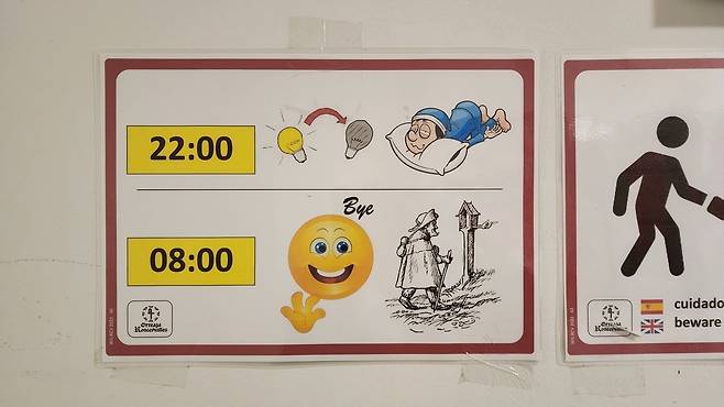 | ▲ 알베르게의 안내판 '10시 소등, 8시 체크아웃' |