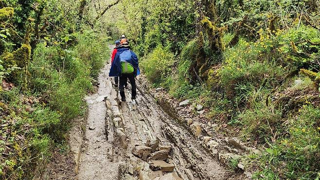 오늘도 비가 온다. 비옷을 챙겨 입고 완전 장비를 갖추어 나선다. 문제는 신발이다. 어제 종일 폭우에 젖은 신발이 밤사이에 말랐을 리 만무다. 그렇다면 젖은 신발을 다시 신어야 하는 상황? 생각만 해도 끔찍했다. 막상 신어보니 또 놀라운 일이 벌어졌다. 젖은 신발도 뽀송한 양말을 신고 신으니 나름 상쾌하다. 적어도 처음 몇 시간은 젖은 운동화의 축축함을 완충해 주었다.