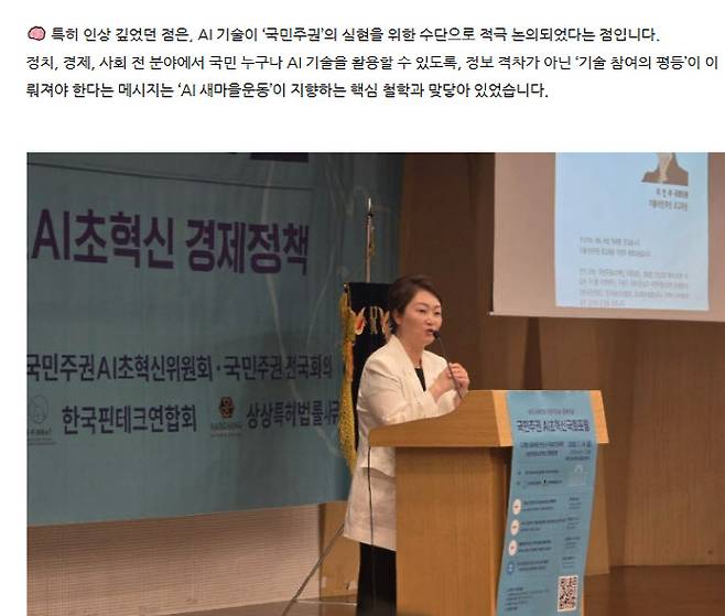 그는 “AI는 단지 기술이 아닌 민주주의의 작동 방식까지 재편하는 문명 전환의 핵심 변수”라며 “국가가 국민을 대표해 인공지능의 방향을 통제하는 ‘국민주권형 소버린 AI’가 AI 3강 실현의 핵심 과제가 되어야 한다”고 했다.