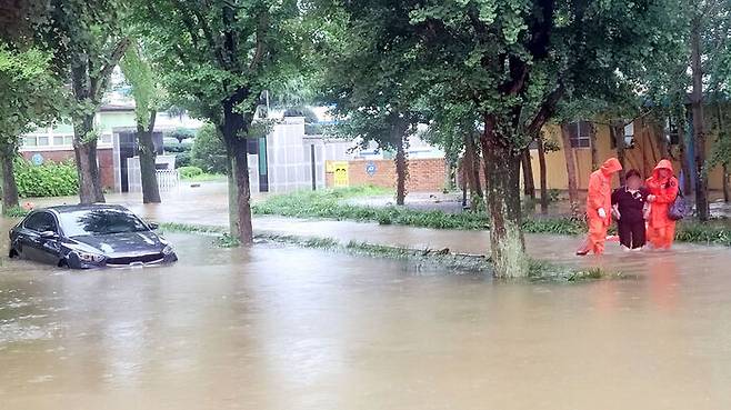 ▲ 호우특보가 발효된 17일 오후 전남 담양군 고서중학교 인근 도로가 물에 잠겨 소방 당국이 안전 조치를 하고 있다.