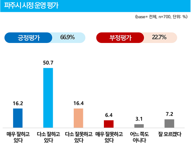 18일 파주시에 따르면 여론조사기관 ㈜글로벌리서치에 의뢰해 수행한 조사 결과, 파주시정에 대한 긍정 평가가 66.9%(매우 잘하고 있다 16.2%, 다소 잘하고 있다 50.7%)로, 부정 평가 22.7%보다 월등히 높았다. 이번 조사는 지난 6월 30일부터 7월 2일까지 3일간 파주시에 거주하는 18세 이상 남녀 700명을 대상으로 실시했으며, 표본 오차는 95%, 신뢰수준은 ±3.7% p이다.