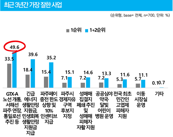 특히 파주시민들은 지난 3년 동안 잘한 사업으로 ①GTX-A노선 개통, 서해선 연장 등 교통 인프라 확충 ②전국 최초로 시행한 긴급 에너지 생활안정지원금 및 민생회복 생활안정지원금 지급 등 파주시 대표 민생정책 ③전국 최대 규모의 파주페이 발행에 따른 파주페이 충전 한도 상향 및 10% 인센티브 지급을 꼽았다.