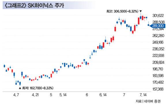엔비디아를 중심으로 한 청사진에 국내 반도체 기업도 적잖은 수혜를 누릴 것으로 예상된다. 현재 엔비디아에 가장 많은 고대역폭메모리(HBM)를 공급하는 SK하이닉스는 AI 칩 수요 증가에 따른 추가 실적 개선이 기대된다. 블랙웰용 HBM3E 공급은 물론, 블랙웰을 잇는 차세대 AI 칩 아키텍처 루빈에 탑재될 HBM4(6세대 HBM) 샘플도 글로벌 반도체 3사(SK하이닉스·삼성전자·마이크론) 중 처음으로 엔비디아에 전달했으며, 현재 테스트를 진행 중이다. 엔비디아 시총이 4조 달러를 돌파한 뒤 SK하이닉스 주가는 30만 원 선을 넘나들고 있다(그래프2 참조). 하나증권은 SK하이닉스 목표주가를 35만 원으로 상향 조정하면서 "최근 엔비디아 AI 칩 수요가 여전히 견조하다는 점이 확인되고 있어 HBM 관련 수요도 기존처럼 양호한 상황이 지속될 것으로 판단한다"고 분석했다.
