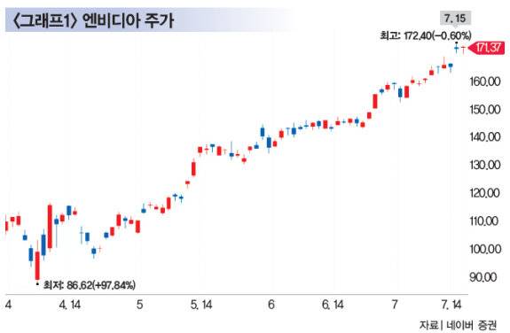 여기에 더해 H20의 중국 판매 재개는 엔비디아 성장세에 날개를 달 것으로 보인다. 이번 조치는 지난달 미·중 무역 협상 당시 중국이 희토류 수출 규제를 해제한 데 대한 대가이자 "엔비디아가 중국에 H20을 자유롭게 팔 수 있어야 화웨이 같은 중국 기업 대신 AI 시장을 장악할 수 있다"는 젠슨 황의 설득을 트럼프가 받아들인 결과다. 대중 수출 통제는 그간 엔비디아의 가장 큰 약점으로 꼽혔다. 1분기(회계연도 기준) 매출에는 55억 달러(약 7조6300억 원)의 H20 재고 상각이 반영됐고, 2분기에도 80억 달러(약 11조1000억 원) 매출 손실이 예상됐다. 그러나 이 같은 리스크가 해소되면서 중국 AI 칩 시장에 대한 영향력을 유지할 수 있게 됐다. 젠슨 황은 7월 15일 중국 언론에 직접 "미국 정부가 우리의 (H20) 수출을 승인해 출하할 수 있게 됐다"고 밝히면서 "H20을 빨리 출하할 수 있기를 기대한다. 이는 매우 매우 좋은 소식"이라고 말했다. 이날 엔비디아 주가(종가 기준)는 사상 최초로 170달러 선을 넘긴 170.70달러를 기록했다(그래프1 참조).