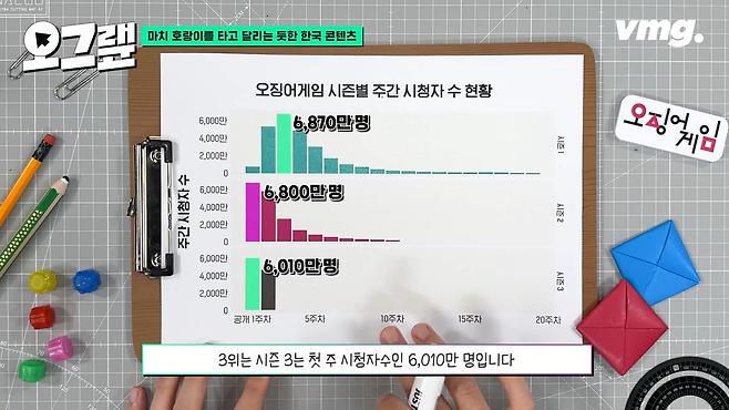 시즌 1이 공개된 3주 차에 주간 시청자수가 무려 6,870만 명을 기록했는데, 이 숫자는 역대 넷플릭스 최고치입니다. 2위는 시즌 2의 공개 첫 주에 찍은 6,800만 명이고요, 3위는 시즌 3는 첫 주 시청자수인 6,010만 명입니다.