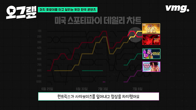 케이팝 아이돌이 주인공이니만큼 영화에 등장한 노래들도 인기몰이 중입니다. 3인조 걸그룹 헌트릭스의 How It's Done과 Golden, 그리고 5인조 보이그룹 사자 보이즈의 Soda Pop과 Your Idol은 모두 3,000만이 넘는 조회수를 기록 중이죠. 미국 스포티파이 차트에서는 이 노래들이 순위 경쟁까지 하고 있습니다. 오그랲 첫 번째 그래프는 사자 보이즈와 헌트릭스의 차트 순위 경쟁입니다.