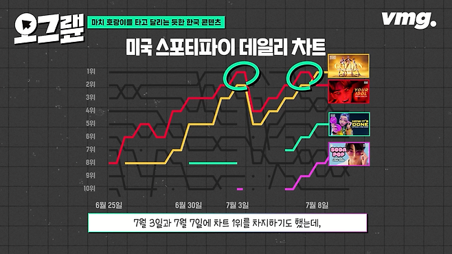 물론 그보다 앞서 사자보이즈의 '유어 아이돌'은 7월 3일과 7월 7일에 차트 1위를 차지하기도 했는데, 이 기록 역시 케이팝 보이그룹 최초 기록입니다. BTS의 '다이너마이트'가 기록한 3위를 넘어서는 신기록을 세운 겁니다.