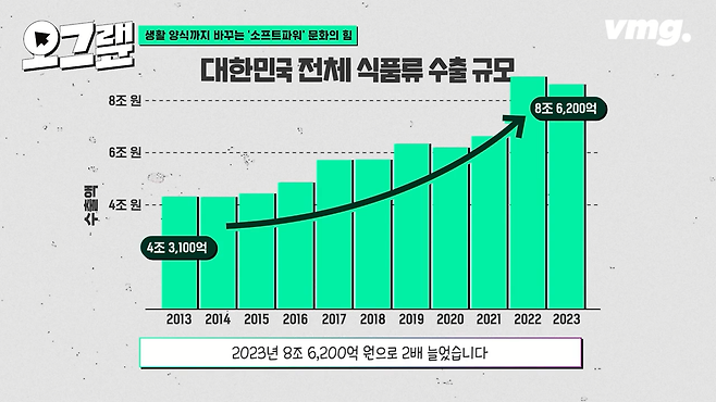 이러한 인기에 힘입어 대한민국 전체 식품류 수출 규모는 2013년 4조 3,100억 원 규모에서 2023년 8조 6,200억 원으로 2배 늘었습니다.