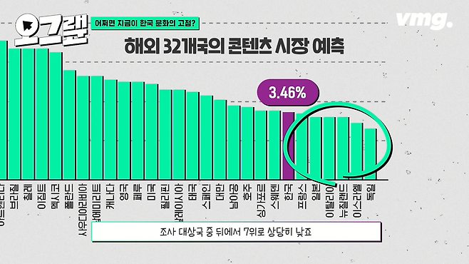 한국콘텐츠진흥원이 2024년 해외 32개국의 콘텐츠 시장을 분석했는데요, 한국의 콘텐츠시장은 향후 5년간 연평균 3.46% 성장할 것으로 예측되었습니다. 조사 대상국 중 뒤에서 7등으로 상당히 낮아요.