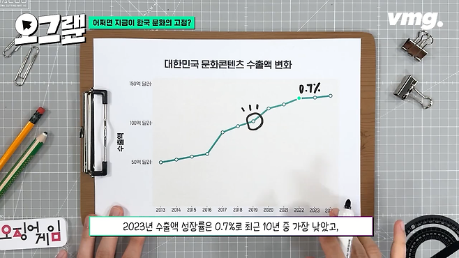 2013년엔 대한민국 콘텐츠 산업 수출액이 채 50억 달러가 되지 않았었는데, 2019년엔 100억 달러를 돌파했습니다. 하지만 최근 들어 연간 성장률이 크게 꺾였어요. 2023년 수출액 성장률은 0.7%로 최근 10년 중 가장 낮았고, 2024년 역시 1.8% 성장에 그쳤습니다.