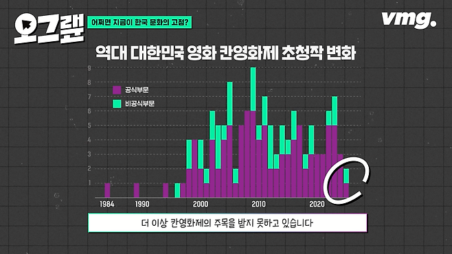 올해 칸영화제에 한국 영화 초청작이 한 편도 없다는 소식이 전해지면서, 이러한 위기론에 불을 지폈습니다. 물론 1차 초청 리스트에 포함되지 않았을 뿐 최종 초청작에는 대한민국 영화 2편이 포함되었습니다. 오그랲 마지막 그래프를 통해 살펴보겠습니다.