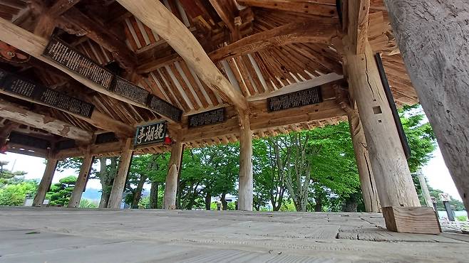 | ▲ 만호정에 걸린 편액과 마루. 세월의 더께가 고스란히 묻어난다. |