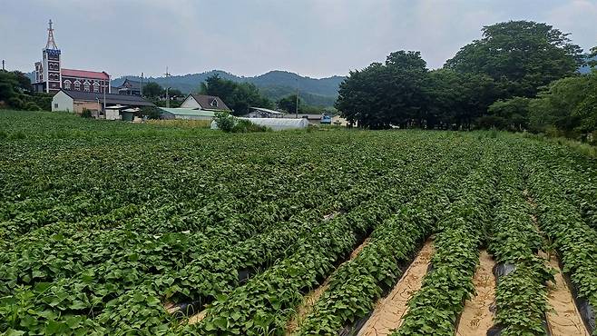 | ▲ 철야마을 풍경. 마을이 밭과 숲, 꽃과 한데 어우러져 있다. |