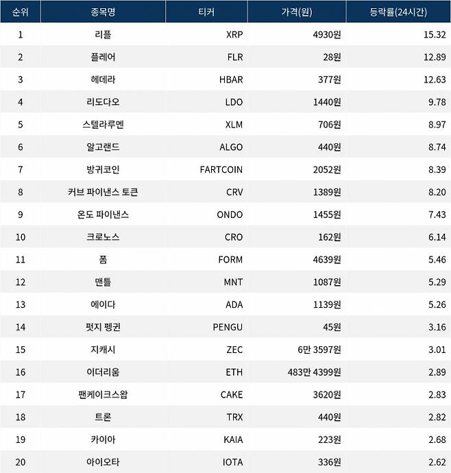 [서울데이터랩]리플·플레어·헤데라, 24시간 가상자산 상승률 상위