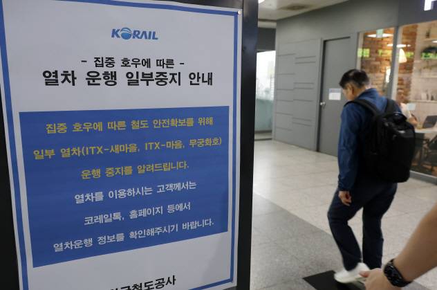 [중부지방을 중심으로 폭우가 쏟아진 17일 오전 대전시 동구 정동 대전역에 열차 운행 중지와 지연 안내문이 걸려 있다. (사진=연합뉴스)]