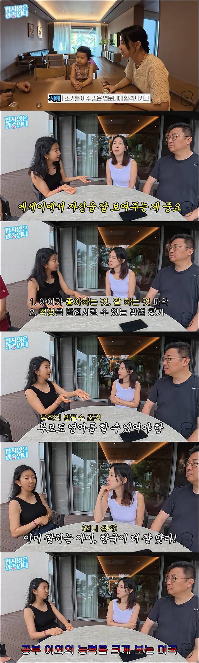 이에 이지혜 부부는 언니의 미국 입시에 대해 궁금해했다. 이지혜는 "좋은 학교를 보낼 수 있는 팁 같은 게 있냐"고 물었고 이지혜의 언니는 "엄마랑 아이가 친해야 한다. 엄마가 아이를 사랑해주면 아이가 엄마한테 고맙잖아. 그러면 자기가 엄마한테 미안한 마음에 더 열심히 하는 경우도 있다"고 밝혔다.