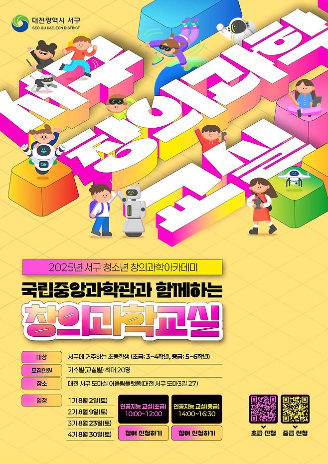 참가 대상은 대전 서구에 거주하는 초등학교 3~6학년 학생 또는 동일 연령대의 청소년으로, 3~4학년은 초급반, 5~6학년은 중급반에 배정된다. 각 과정은 4기씩 운영되며, 기수별 20명씩 총 160명을 모집한다. 첫 수업은 8월2일에 시작되며, 참여 신청은 이달 15일부터 QR코드를 통해 가능하고 선착순으로 마감된다.