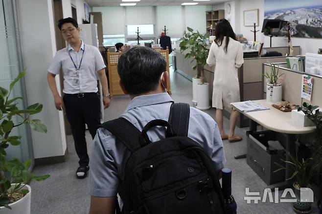 [서울=뉴시스] 김명년 기자 = 김건희 특검 관계자가 18일 오전 서울 여의도 국회 의원회관 권성동 의원 사무실로 압수수색을 위해 들어가고 있다. 2025.07.18. kmn@newsis.com