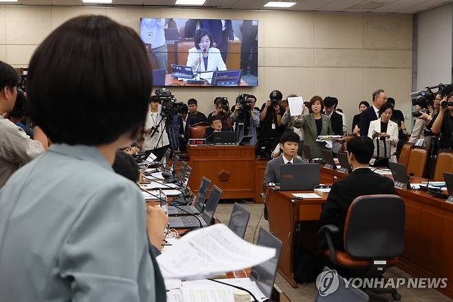 (서울=연합뉴스) 김주형 기자 = 18일 서울 여의도 국회 보건복지위원회에서 열린 정은경 보건복지부 장관 후보자 인사청문회에서 국민의힘 김미애 의원이 정 후보자 배우자의 주식 투자 의혹과 관련해 항의하고 있다. 2025.7.18