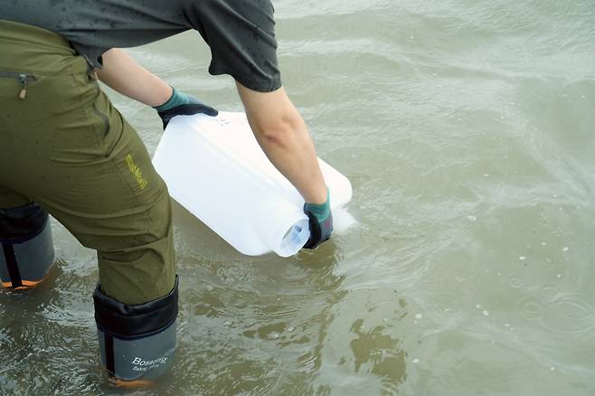 | ▲ 원자력안전위원회는 4일 최근 제기되는 북한 평산 우라늄 정련공장 폐수 문제와 관련해 시료 채취를 위해 한국원자력안전기술원(KINS) 전문가들을 강화도 현장에 파견했다고 밝혔다. 이날 시료 채취는 6개 지점에서 이뤄졌으며, 시료는 KINS 분석실로 옮겨져 세슘 및 우라늄과 중금속 오염 여부에 대한 정밀 조사가 이뤄질 예정이다. 사진은 이날 강화도에서 한국원자력안전기술원 전문가가 시료 채취하고 있는 모습. |