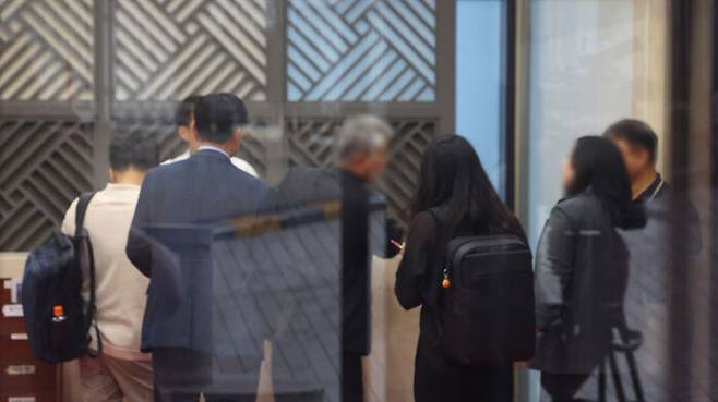 ▲ 18일 김건희 여사 관련 의혹을 수사하는 민중기 특별검사팀이 압수수색을 실시한 서울 용산구 통일교 서울 본부에서 검찰 관계자들이 직원들과 대화하고 있다.