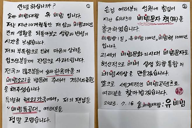 유비빔은 지난 16일 자신의 소셜미디어 계정에 "지난 10개월 동안 제 삶과 비빔 20년간의 생활을 되돌아보고 성찰과 반성의 시간을 보냈다"며 "제 부족함으로 인해 마음의 상처를 입으신 분들께 진심으로 사과드린다"는 내용의 자필 편지를 공개했다.
