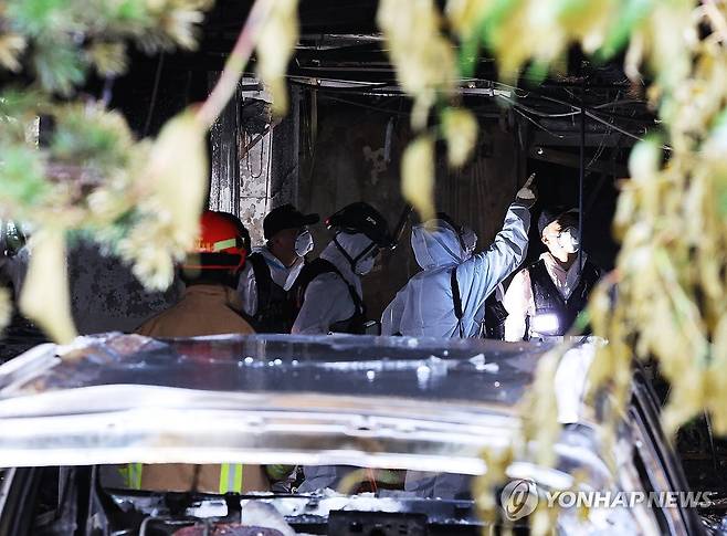 (광명=연합뉴스) 홍기원 기자 = 전날 주차장에서 발생한 화재로 다수의 인명피해가 발생한 경기도 광명시 소하동 한 아파트에서 18일 경찰과 소방, 국과수 등 관계자들이 합동 감식을 하고 있다. 2025.7.18