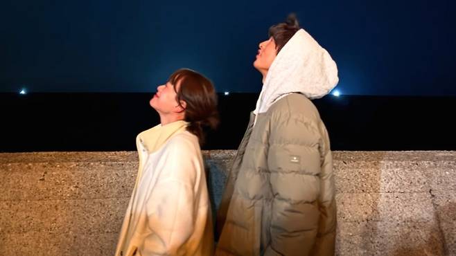 공개된 사진에서 송중기는 두꺼운 외투에 후드 모자를 눌러쓴 채 밤하늘 아래 밝은 미소를 지으며 여유로운 분위기를 자아냈다. 그 옆에는 배우 천우희가 다정하게 어깨에 머리를 기대고 브이 포즈를 취하고 있어 두 사람의 친근한 케미가 돋보인다.