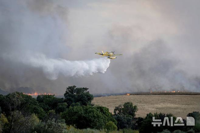 [마드리드=AP/뉴시스] 17일(현지 시간) 스페인 마드리드 외곽 나발카르네로 인근에서 소방 항공기 한 대가 산불 현장에 물을 투하하고 있다. 2025.07.18.