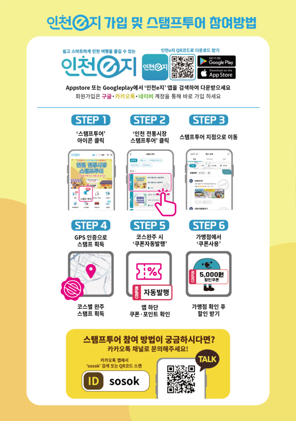 방문객은 총 15개 코스 중 원하는 코스를 선택해 전통시장과 주변 관광지를 방문하면 GPS 자동 인증으로 스탬프가 발급된다. 코스 1개를 완주할 때마다 5,000원 할인쿠폰이 '인천e지' 앱(만 14세 미만도 가입 가능)에서 즉시 제공되며, 전 코스(15개) 완주 시 최대 7만5,000원까지 혜택을 받을 수 있다.