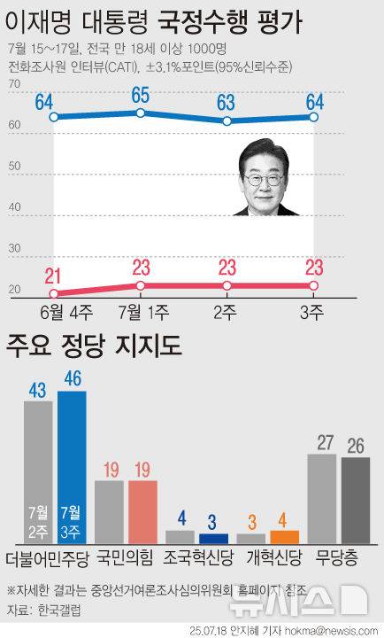 [서울=뉴시스] 한국갤럽이 7월 셋째 주 이재명 대통령의 국정수행 평가를 조사한 결과 64%가 '잘하고 있다'고 응답했다. '잘못하고 있다'는 응답은 23%로 집계됐다. 긍정적으로 보는 이유를 묻자 '경제·민생'이 17%로 가장 높았다. 소통(15%), 추진력·실행력·속도감(10%), 유능함(6%), 서민정책·복지(4%) 등이 뒤를 이었다. 정당 지지율에서는더불어민주당 46%, 국민의힘 19%로 집계됐다.