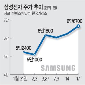 전날 삼성전자 주가는 전 거래일 대비 3.09% 상승한 6만6700원을 기록하면서 연중 최고치를 경신했다.