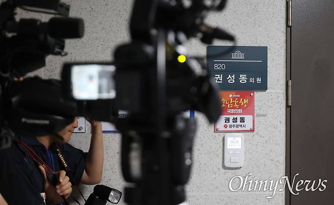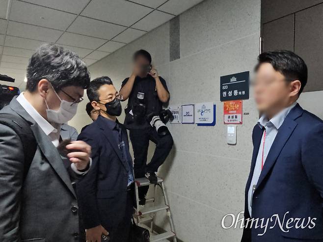 오후 12시 10분엔 권 의원이 직접 모습을 드러냈다. 곧장 의원실로 들어가려던 그는 '압수수색 어떻게 생각하시나'라는 <오마이뉴스>의 질의에 발걸음을 멈추고 "정말 어이가 없다"라고 운을 뗐다.
