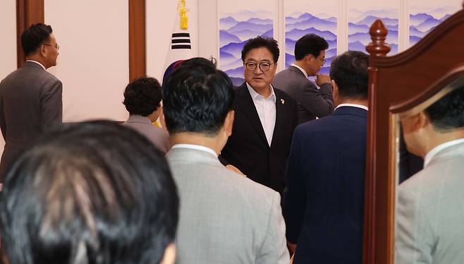 | ▲ 국민의힘 송언석 비대위원장 등 원내지도부가 18일 오전 서울 여의도 우원식 국회의장실을 찾아 김건희 여사 관련 의혹을 수사하는 민중기 특별검사팀의 권성동 의원실 압수수색을 항의하기 위해 우 의장과의 면담을 기다리고 있다. |