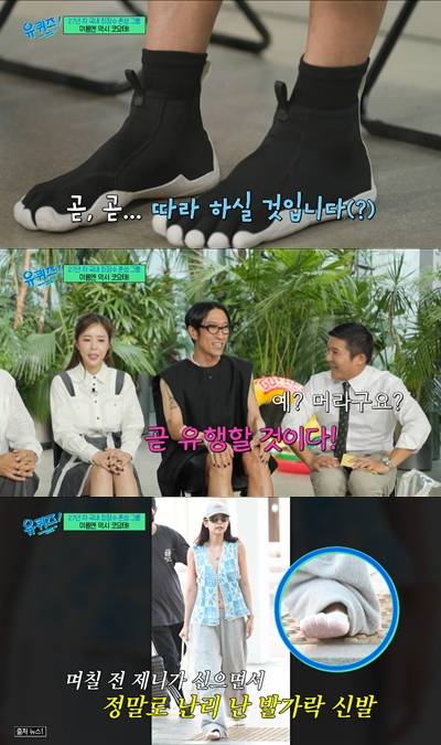 그는 "발가락이 각각 들어갈 수 있도록 분리된 디자인이 특징"이라며 "기능성으로 등산이나 필라테스로 쓰였던 건데 이효리 씨가 평소 등산이랑 요가를 좋아한다. 거기에 맞춰서 일상에 자연스럽게 신기 시작한 거다. 블랙핑크 제니는 공항 패션으로 청바지에 매치해서 편안한 실용성을 강조했고, 신민아 씨까지 원피스와 함께 스타일링해서 발레리나를 연상시킨다는 평가가 있었다"고 덧붙였다.