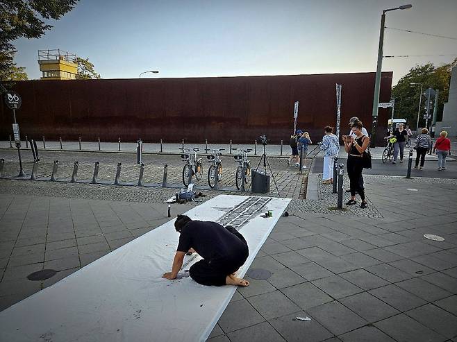 | ▲ 탁본 작업 중인 성백 작가 베를린 장벽 기념 공원 현장 |