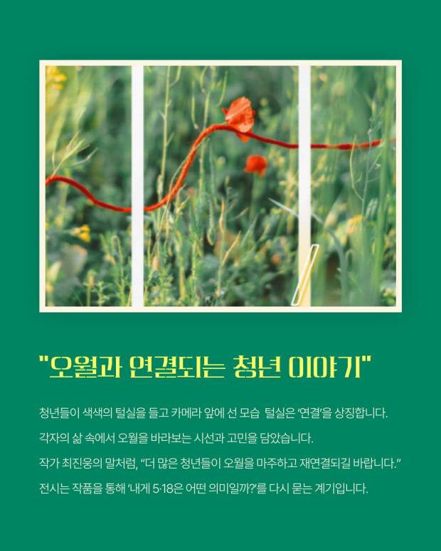 이번 전시는 청년들의 현재 삶의 5·18의 의미는 무엇인지, 오월을 통해 다시 세상과 재연결 되는지에 다룬 '연결을 향한 기록의 여정'이다.