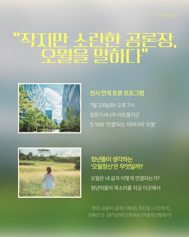 23일에는 연계 토론 프로그램 ‘작지만 소란한 공론장’도 열려 청년들이 자유롭게 오월정신을 나눈다. 이들은 5·18이 혐오와 차별을 넘는 연대, 다양성, 공정이라는 청년들의 가치와도 맞닿아 있다고 말한다. 이번 전시는 청년들의 현재 삶의 5·18의 의미는 무엇인지, 오월을 통해 다시 세상과 재연결 되는지에 다룬 ‘연결을 향한 기록의 여정’이다.